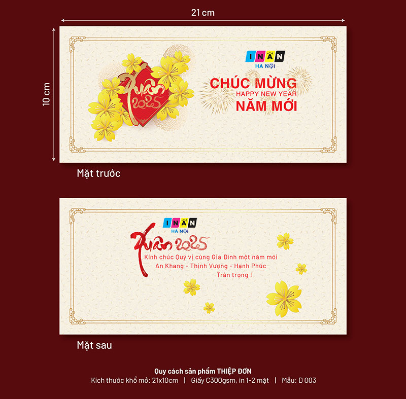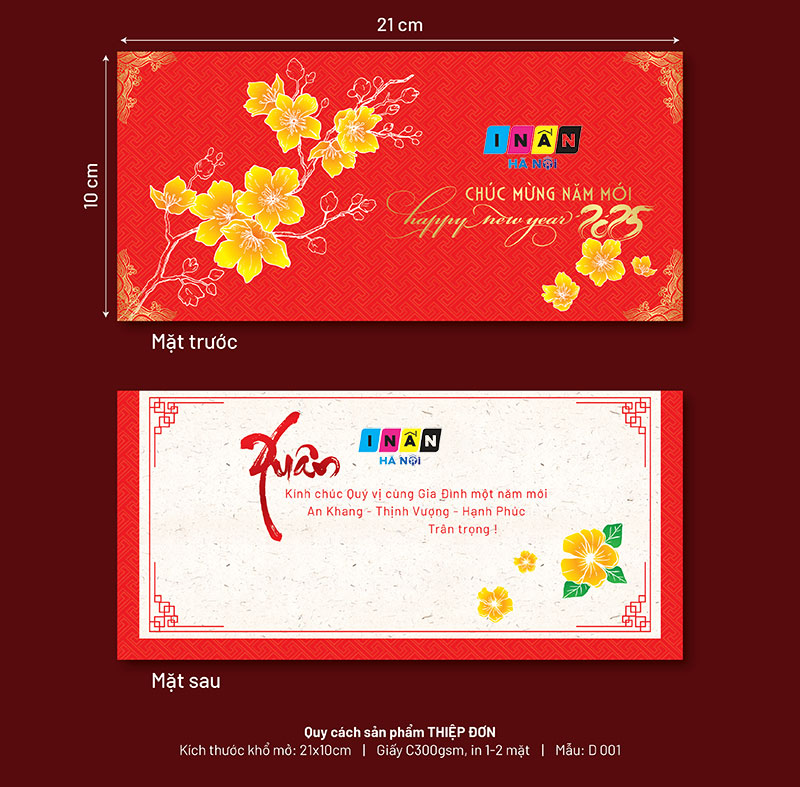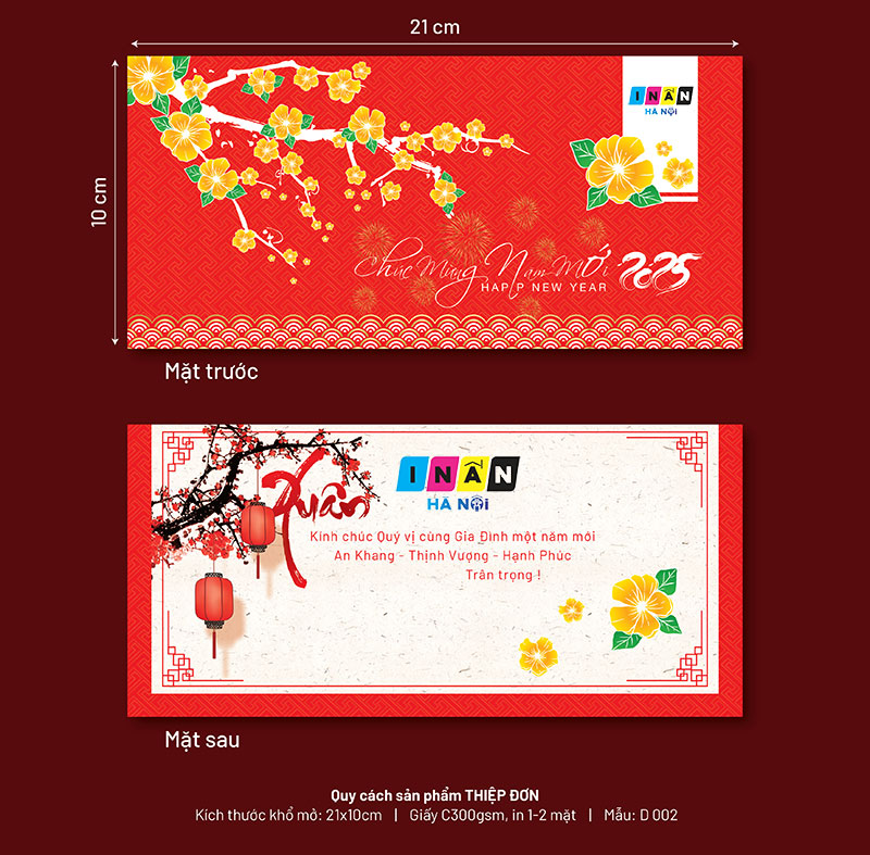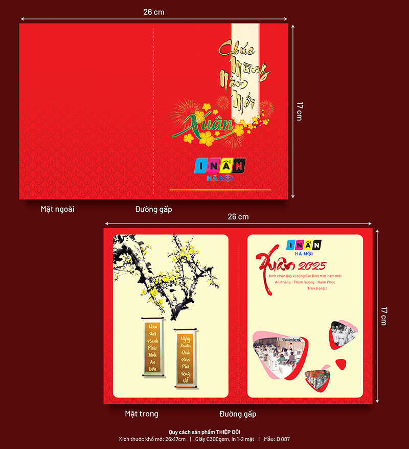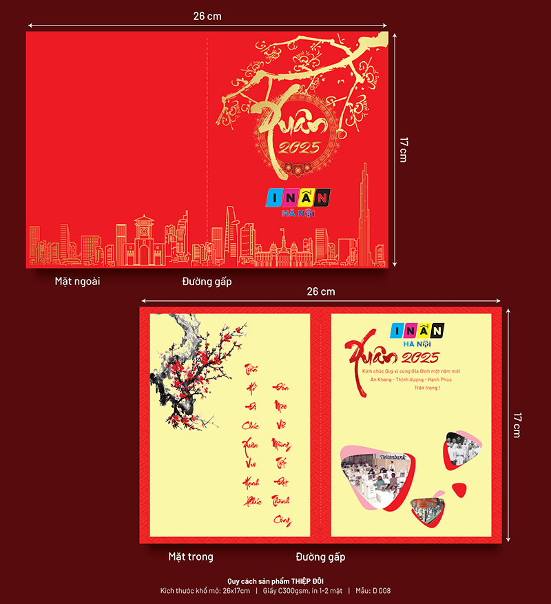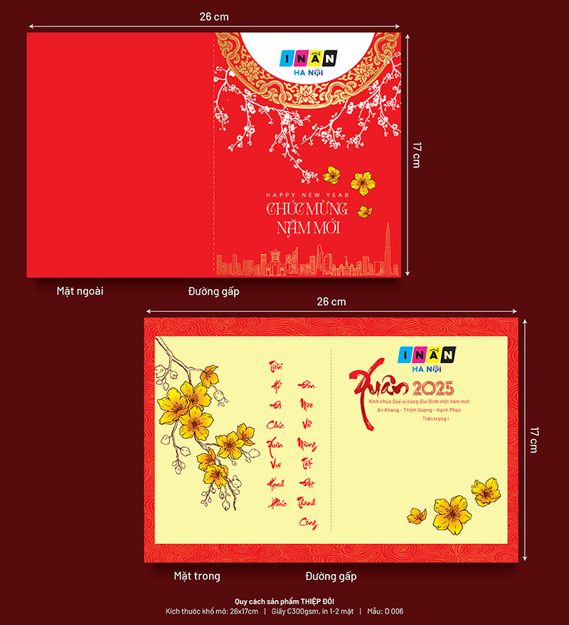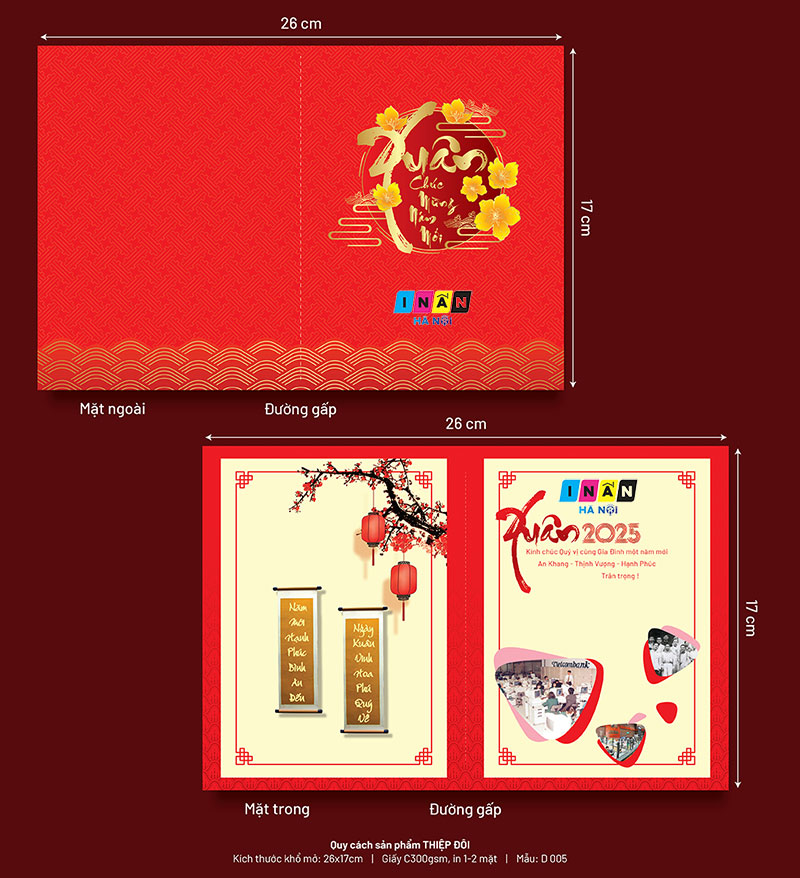 Thiết kế In ấn Thiệp chúc Tết, in thiệp chúc mừng Năm mới thể hiện sự tôn trọng của Bạn đối với người được nhận, đòi hỏi sự đầu tư nghiêm túc từ mẫu thiết kế đến chất lượng in ấn cũng như chất liệu giấy. Nắm bắt được xu thế và tầm quan trọng, In Hà Nội luôn đi đầu về dòng sản phẩm thiết kế – in thiệp chúc Tết cao cấp để phục vụ Quý khách hàng một cách tốt nhất.